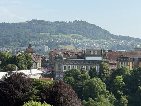Anschliessend verschob sich die ganze Gruppe Richtung Kursaal Bern – nicht ohne unterwegs noch an der Frauendemo vorbeizukommen, die mit lautstarker Energie und starken Botschaften ebenfalls Eindruck hinterliess.